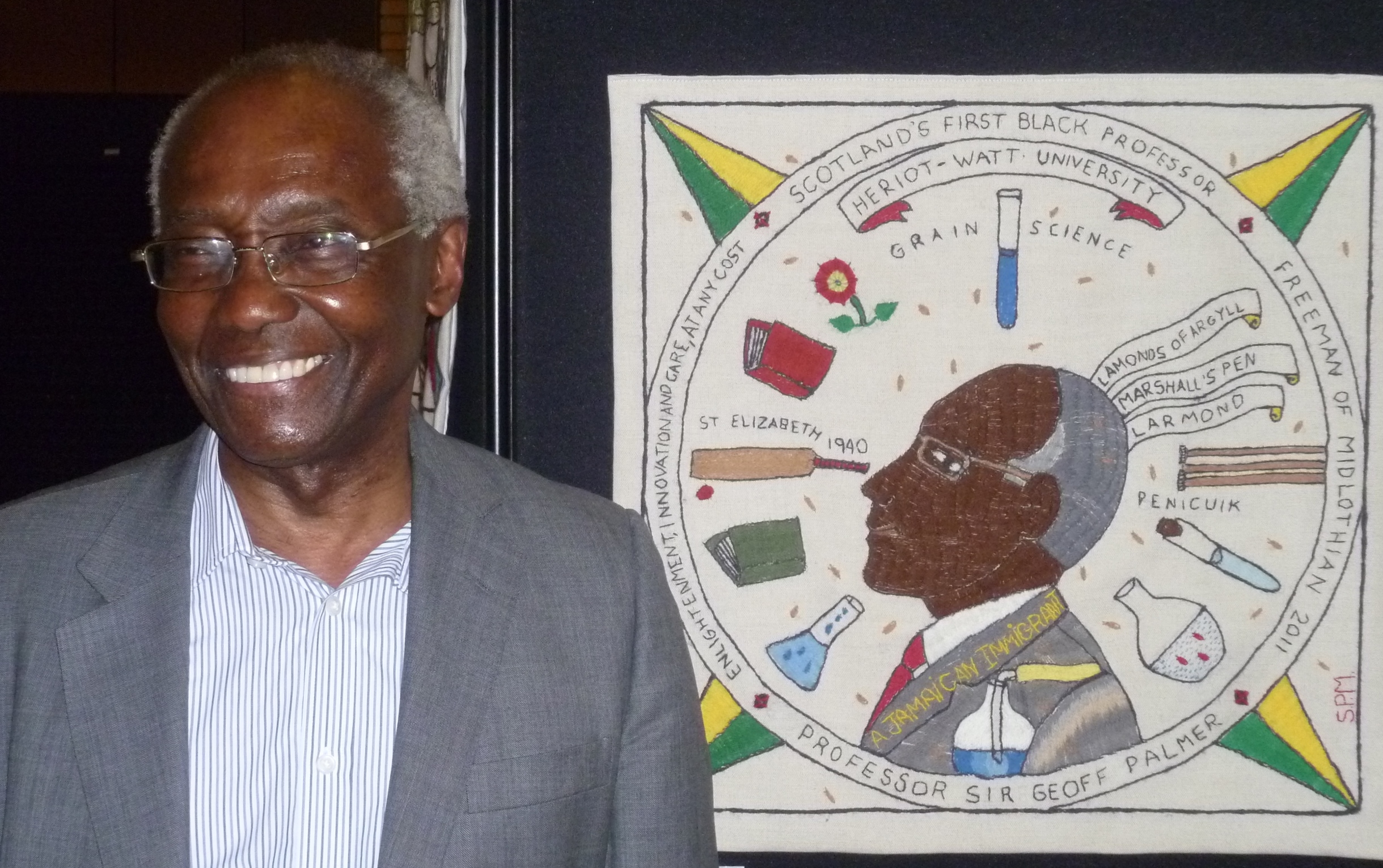 Geoff, now Sir Geoff Palmer retired grain scientist and recent historian of Jamaica with his Scottish Diaspora Tapestry panel
